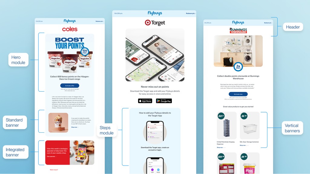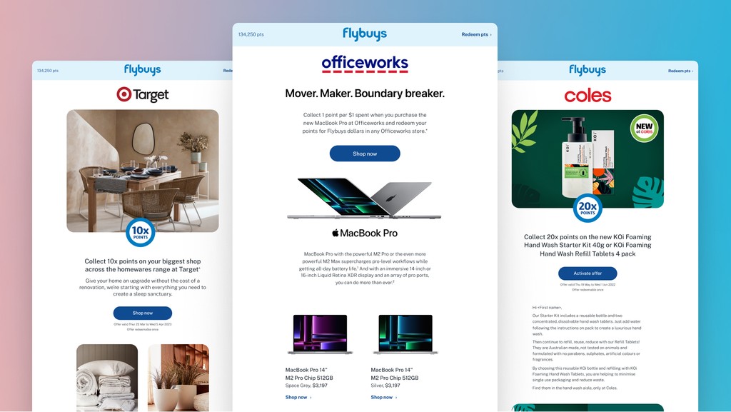 Another challenge was the visual hierarchy between Flybuys and its partners. Most of Flybuys' email communications are co-branded, so the balance between brands and products needs to be right. To achieve this, headings and footers were created that encapsulate both brands and digital guidelines were developed around colour, typography, imagery, copy and email modules. This created a consistent visual hierarchy across email communications.