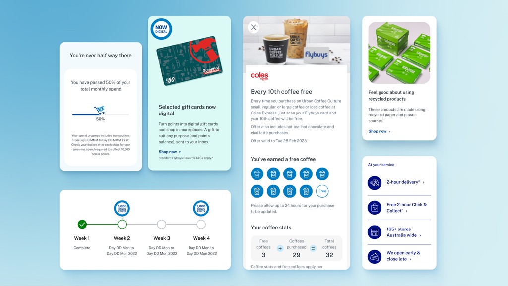 To create consistency across digital channels and create efficiencies for designers, I built a scalable design system (Phoenix) for Flybuys’ digital channels (predominately email, social, web and app) and led a team of digital and creative designers through the transition from Sketch to Figma.