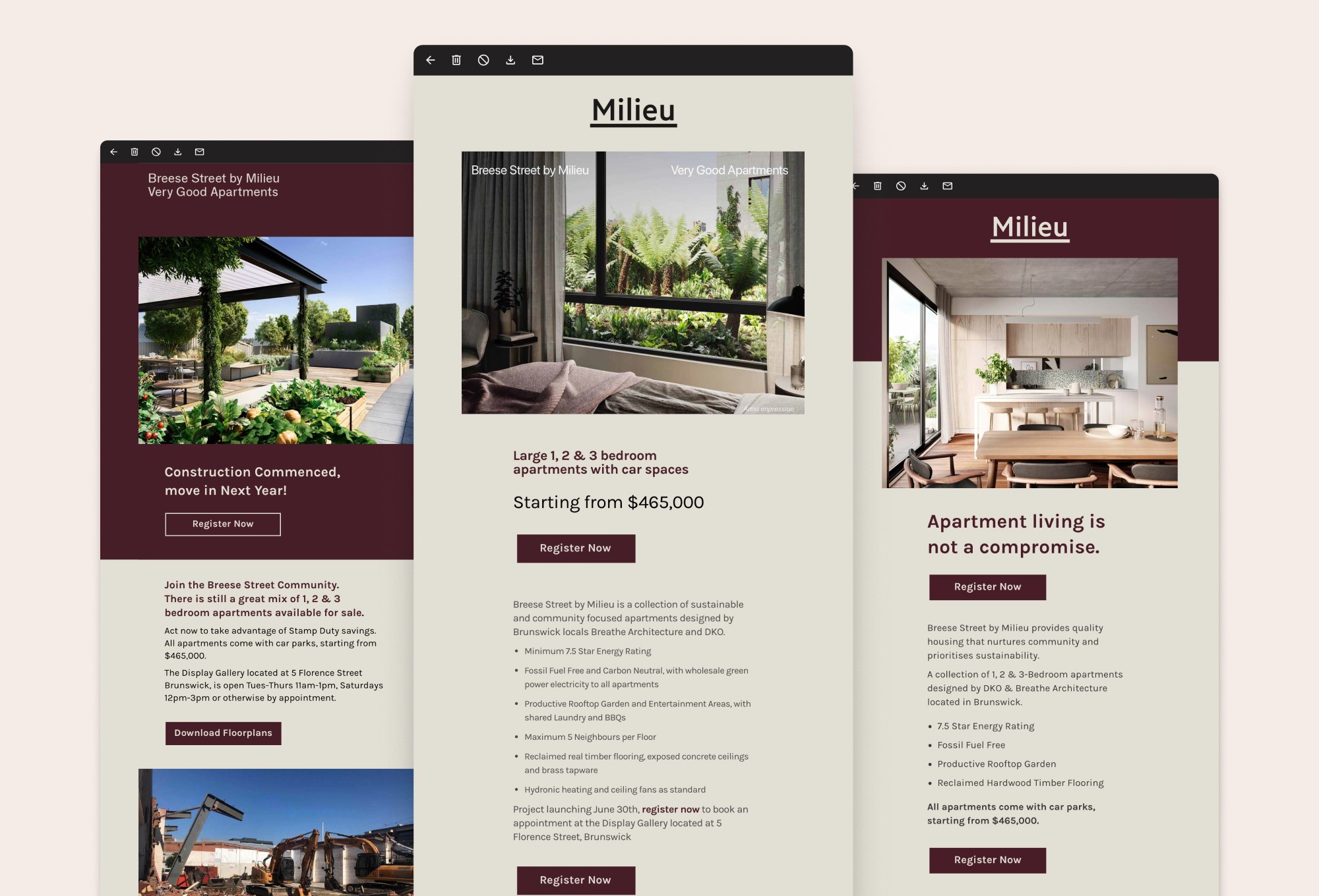 I also worked on email marketing campaigns and display advertising to direct traffic to the lead-capture sites. Working with the assets provided from the client I would expand upon their branding and include content to entice potential buyers into finding out more about the new home developments.