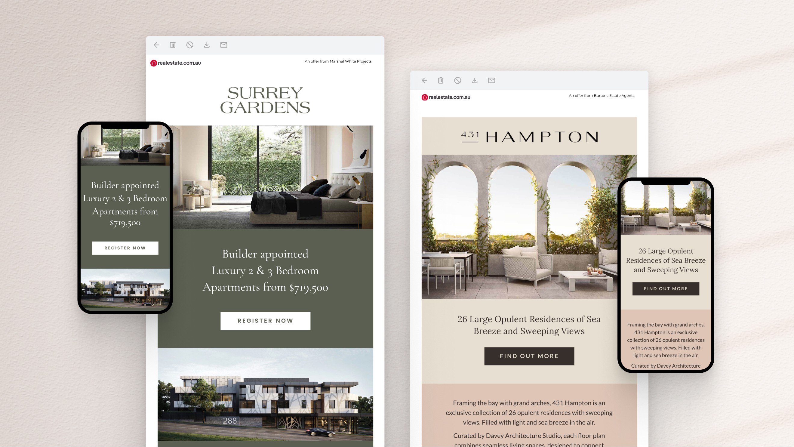 Working as the Digital Designer at the in-house creative agency for the ‘Developer’ team at REA Group, I worked closely with clients (property developers) to understand their lead strategy, unique selling proposition and branding journey. With an increase in new developments across the country, property developers were in need of a way to promote the stand-out features of their developments and connect to potential buyers.